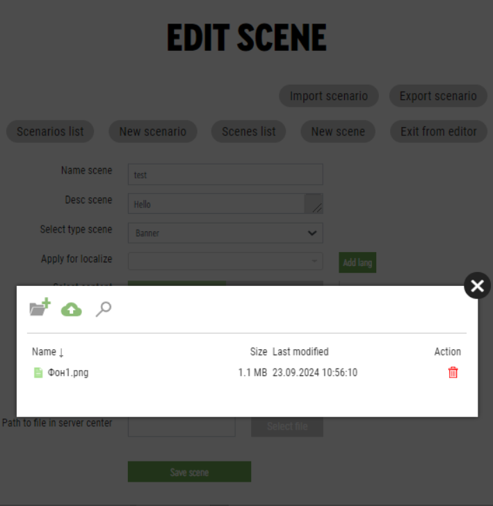 You can add several scenes, then they will appear one after another in the order of placement in the scenario. To add another scene, you need to click the button . To delete a scene, you need to click on the button .