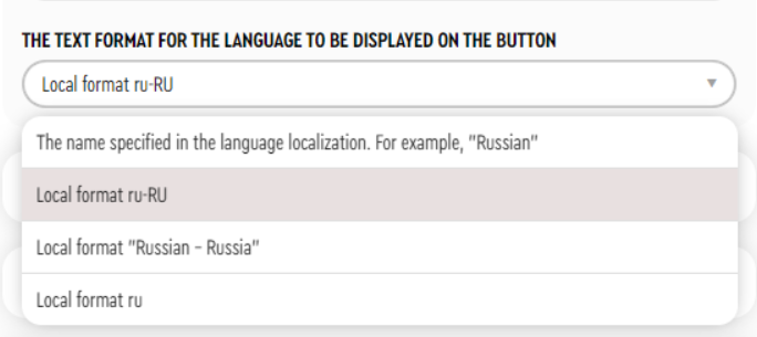 When this option is disabled, the language selection button is missing. - Also select the button display format. To do this, assign one of the suggested values to THE TEXT FORMAT FOR THE LANGUAGE TO BE DISPLAYED ON THE BUTTON parameter.