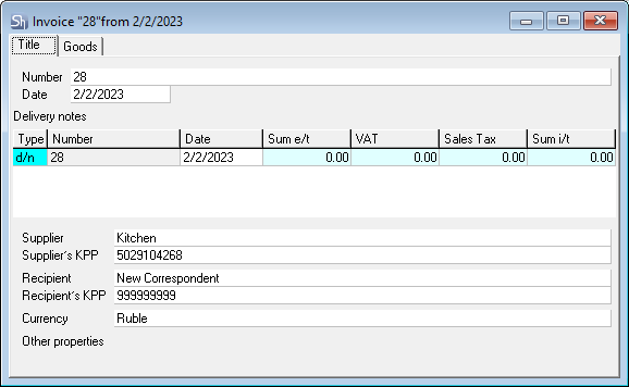 The Supplier, Supplier's KPP, Recipient, Recipient's KPP, and Currency are filled in automatically according to the data of the delivery note for which it was created.