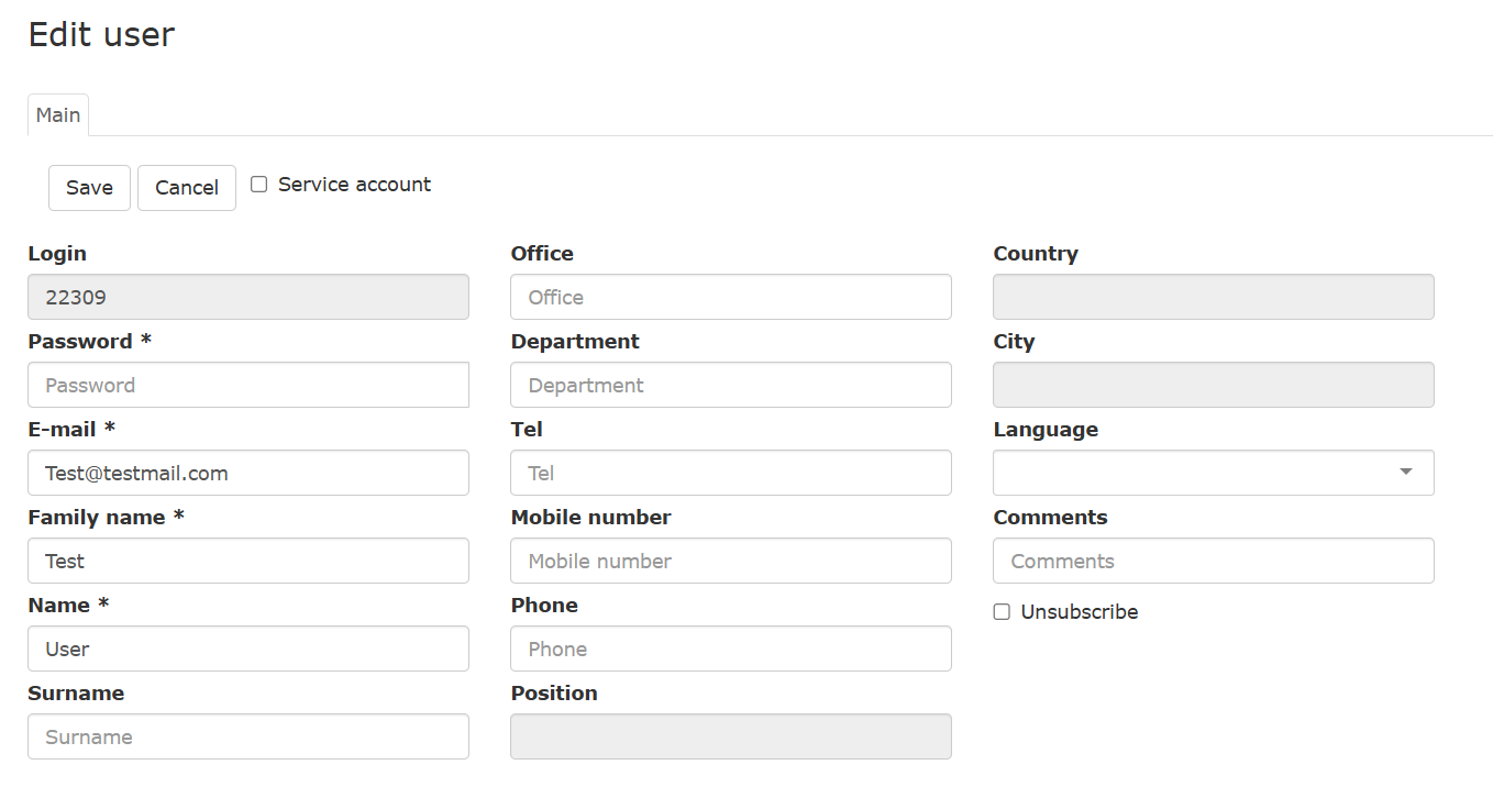 The user card is the place where you can change your personal data. To enter the card, click on the user name in the upper right corner: