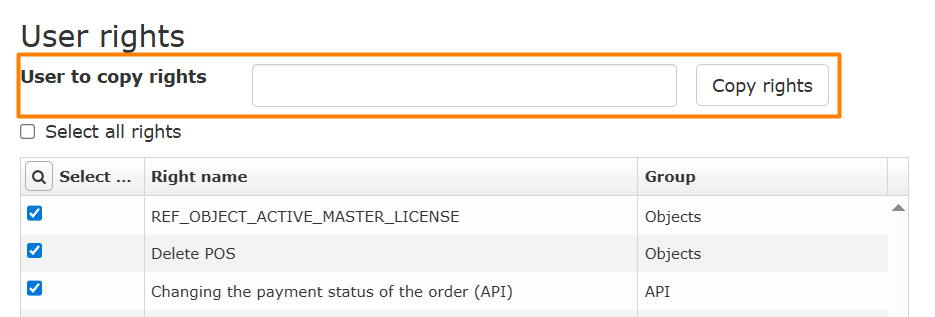 - In the User to copy rights field, select the user whose rights you want to copy.