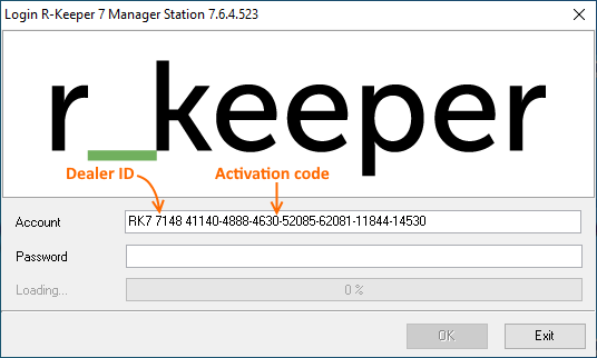 After the order is confirmed by r_keeper employees, open the order and copy the activation code, which must be entered in the manager station. Open the manager station and enter: