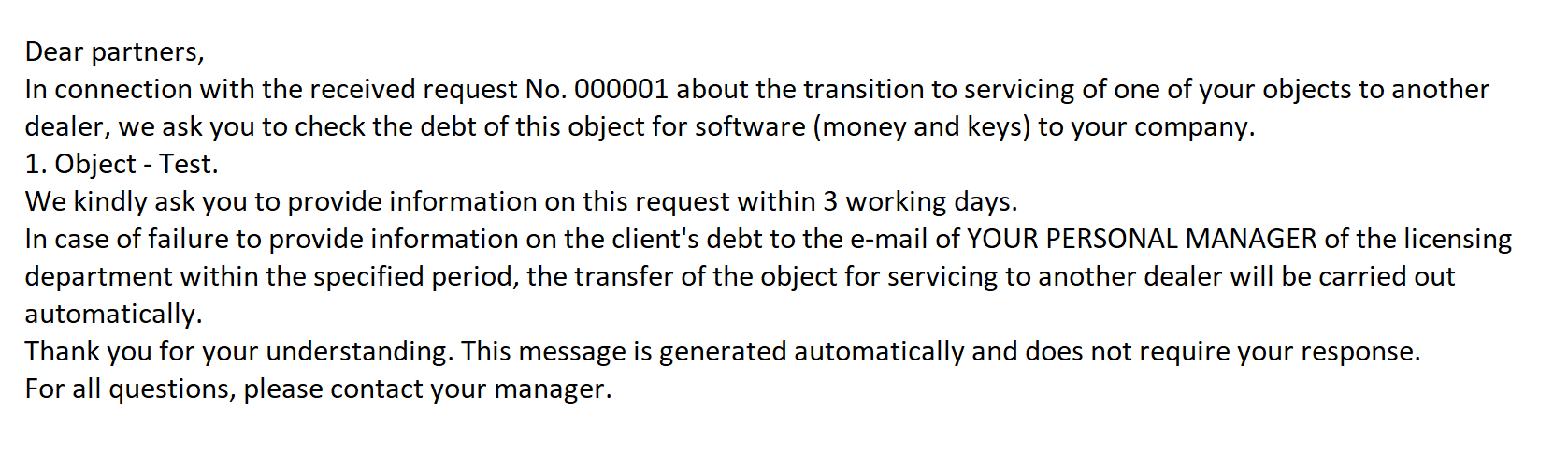 If the object is found to have debts to the company or the current dealer, then the change of dealer will be suspended until the debts are paid off.