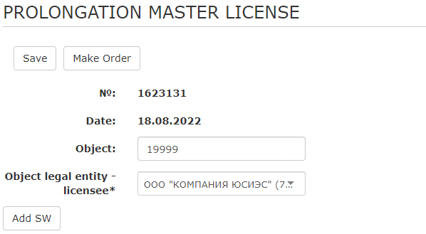 After the order is confirmed, the validity period of the master license for this object will increase by an agreed period. After the master license prolongation, use the New license button in the object card to generate a prolongation code. The old license will be marked as inactive.