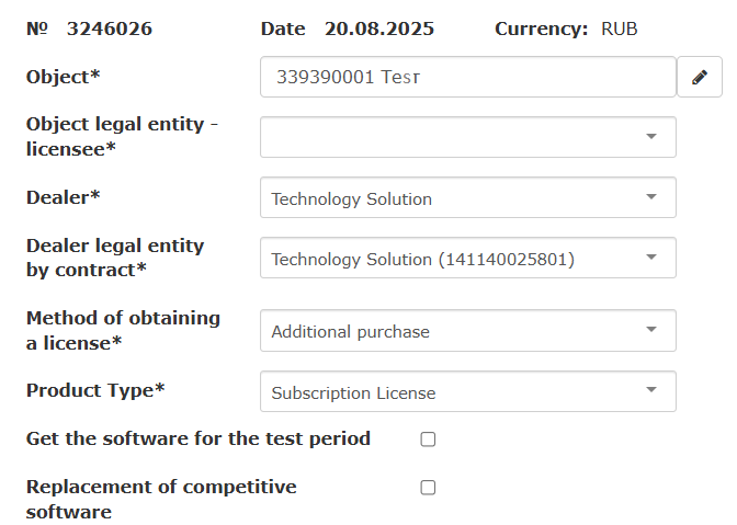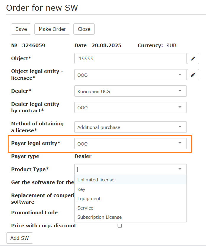 If the product in the Sales Scheme indicates LifeTime or Subscription when selecting software, then when creating an application for the software, the legal entity of the dealer is automatically pulled into the Payer Legal Entity field because sales of this software are carried out under a license agreement with the dealer.