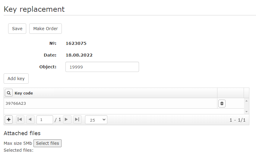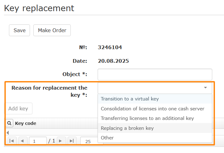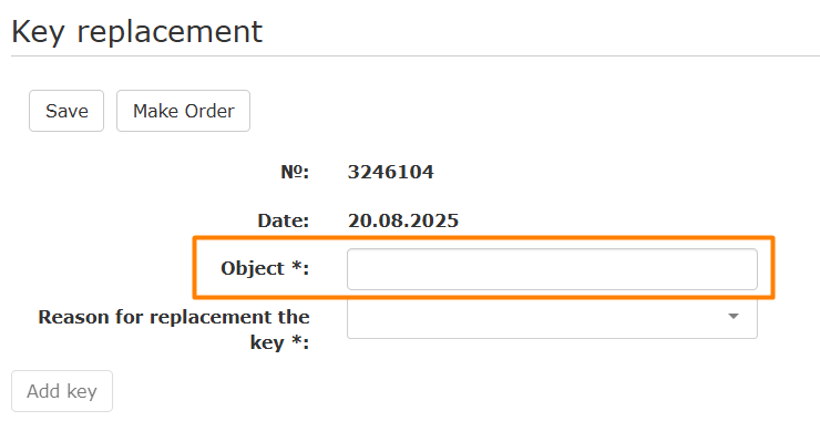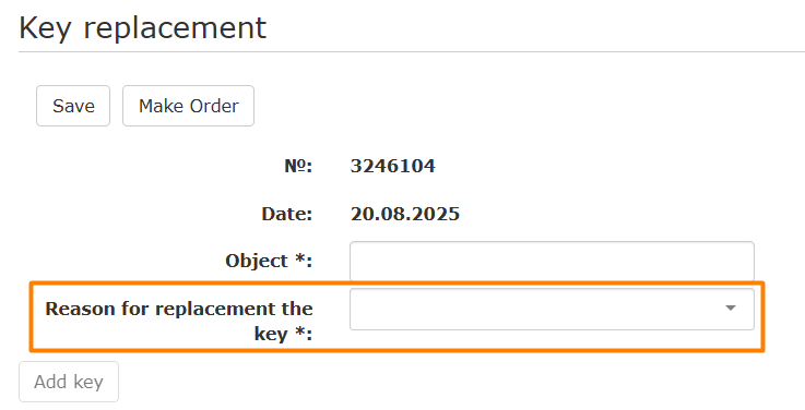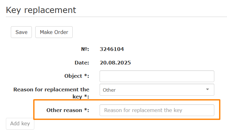 - When trying to order an application, without a filled field, an error is displayed: The reason for replacing the key is not filled