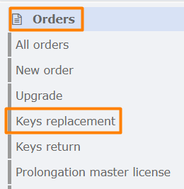 - In the Licensing System, go to Orders and select the Replace Keys Order