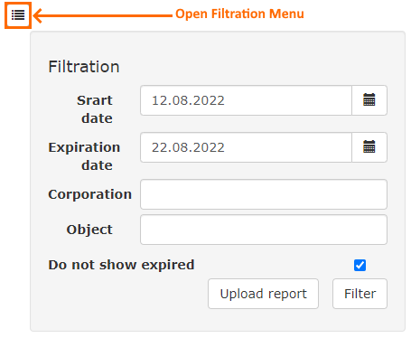 Click the filter button. Specify the period during which you want to check the license expiration. Specify the object or corporation code.