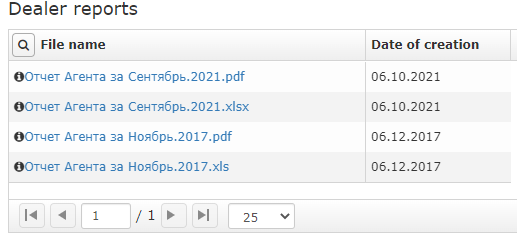In the Dealer reports section, you can view completed reports of the Agent under the Agency Agreement with a list of functions performed during the period and the amount of the agency fee.