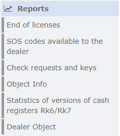 In the Reports section, you can get information on licenses, keys and SOS codes.