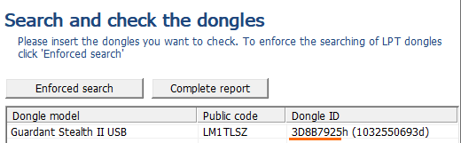 The Dongle ID is the key code without the final h. It matches the key code in the licensing system. In this case, the key code is 3D8B7925, you can find it in the system and see the linked licenses.