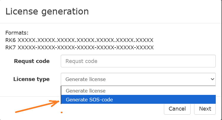 SOS Code is a temporary license generated in emergency cases. It can only be used if it is impossible to generate an active license.