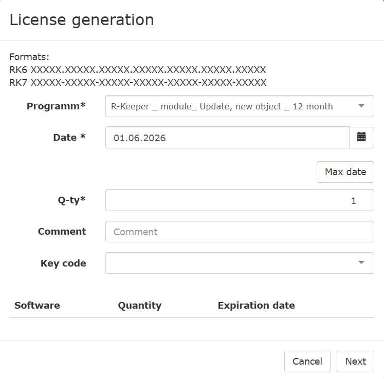 Fill in the request fields. Select the required license, specify the date, quantity. In the Comment field, specify the reason for renewal. Click Next.