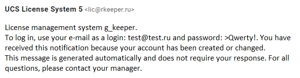 After creating a new user in the license system, an email with a username and password generated by the system will be sent to the specified email address.