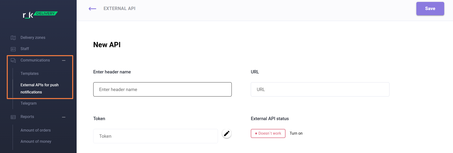 - Add the external API URL for sending push notifications from r_k Delivery.