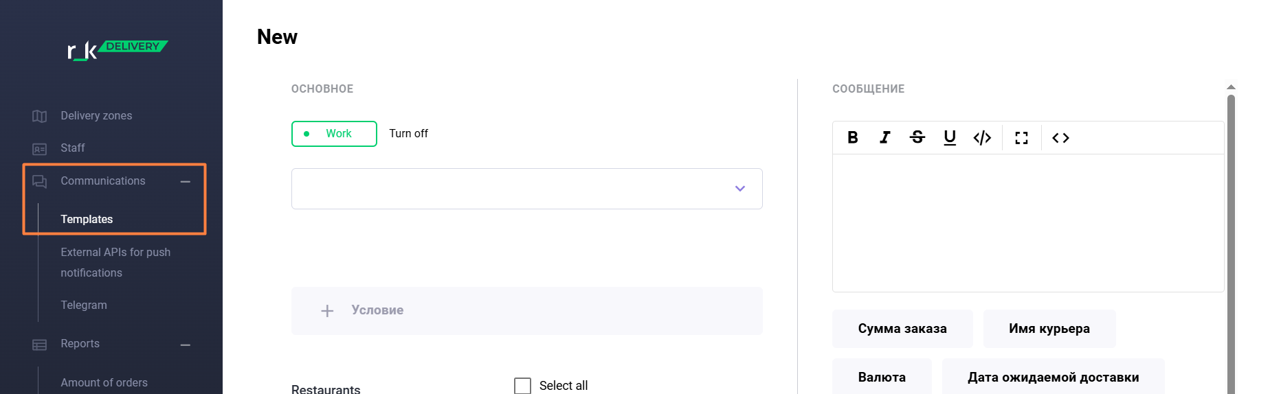 - Add a condition for receiving a notification. For example: Status > Equal > Transferred to kitchen