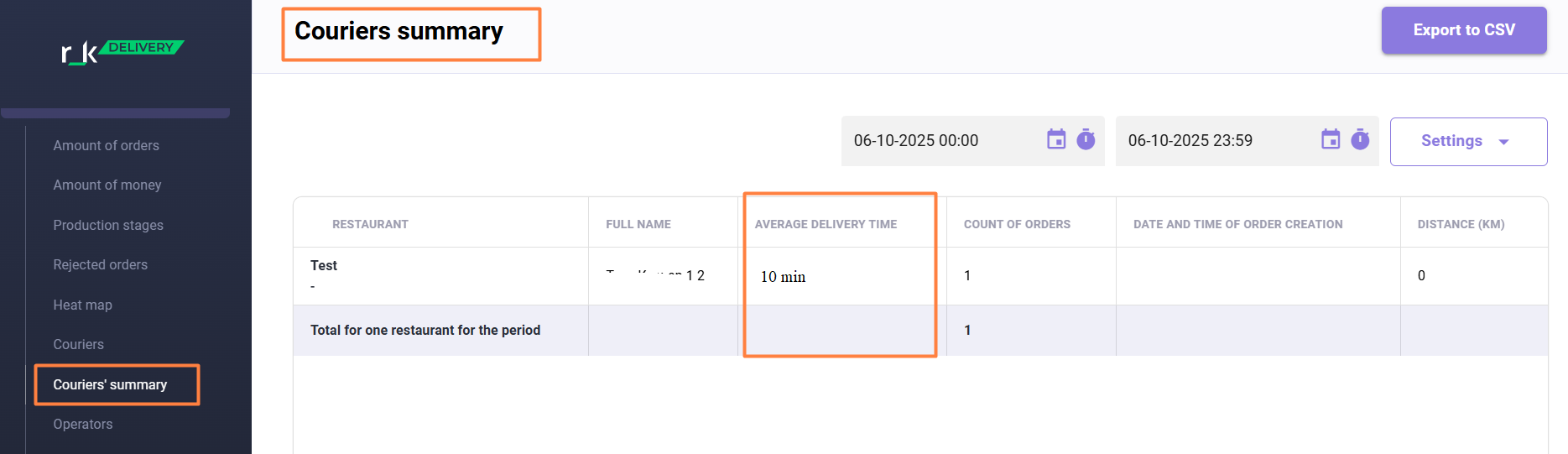 Supplement the courier summary report with data on the average delivery time for each courier over the period. If the couriers of the establishment operate by delivery zones, this metric, along with the number of delivered orders, may be considered for calculating wages.