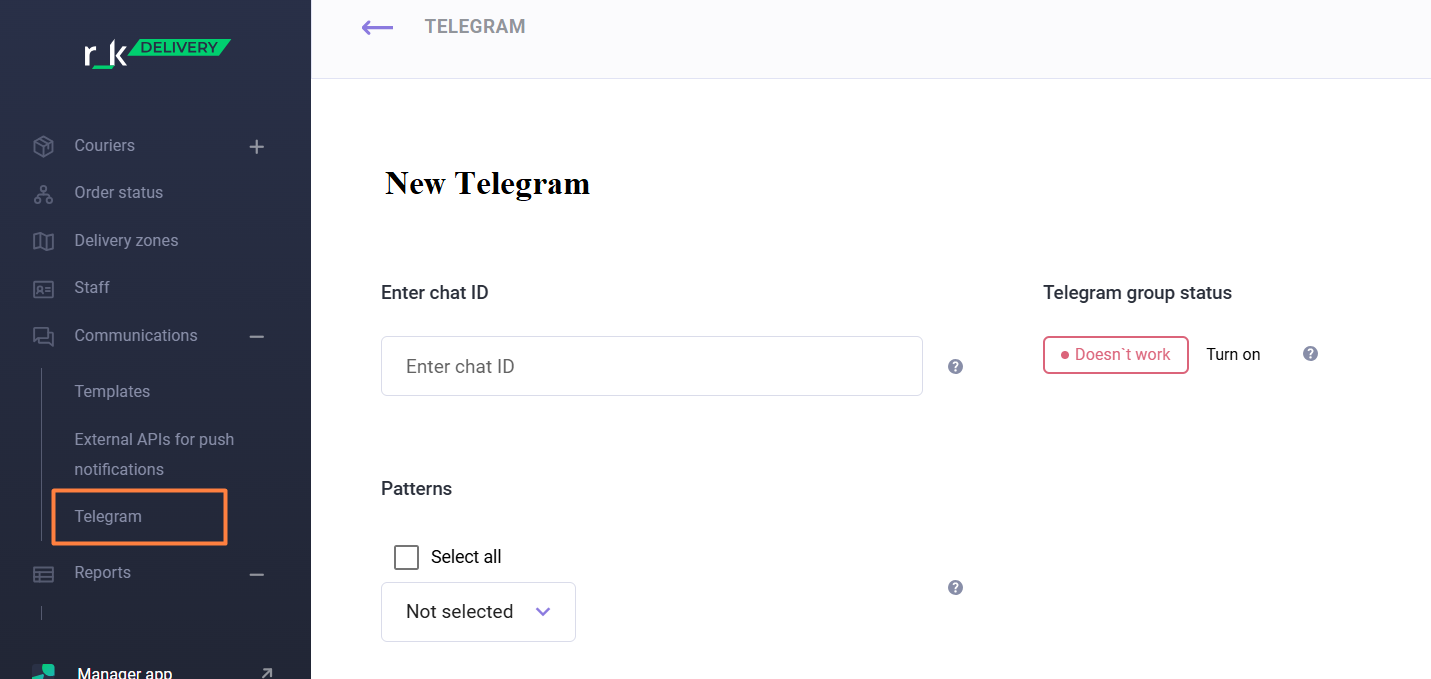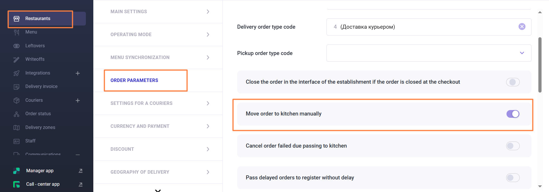 Now you can receive error messages not only in personal messages, but also in work Telegram groups. For this purpose, a new Telegram section was created in the Communications menu. To set it up, you will need the chat ID of the group to which notifications will be sent. You can find out the chat ID using the @usernametoid_bot bot. 2. Added a new setting to the establishment card — Send order to the kitchen manually. If it is enabled, orders will no longer be transferred to the kitchen automatically after the status is Accepted in the restaurant. The restaurant manager will always need to manually press the Sent to Kitchen button. The modification was made for establishments that require additional control and manual management before cooking begins. By default, the parameter is disabled, and orders, as before, are sent to the kitchen automatically when it is time to cook them.