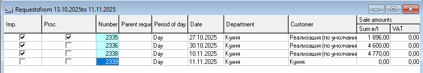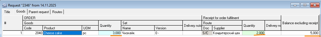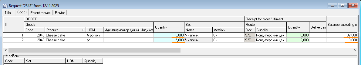 When opening a request, the current stock is displayed, without considering theoretical write-offs, therefore in Fig. 479 with a stock of 5 pcs., the calculated required receipt is 2 pcs. This is because at the moment of opening request No. 2343, without creating delivery notes for request No. 2346, the goods stock is 40 portions=> 5 pcs.