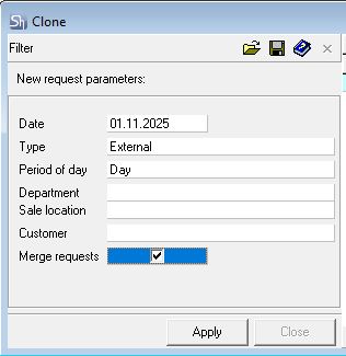 Date– specify the date for which the new requests will be created. If the date is not specified, copies will be created with the dates of the selected requests. Type– define the type of requests to be created (internal or external). Requests can only be created of one type. This field is mandatory. Day Period– set the day period with which the new requests will be created. If the field is not filled, the value will be taken from the source requests. Department– if a specific department needs to be specified for the created request copies, fill in this field. If the field is not filled, the department will be taken from the source requests. Sale Location– if a specific sale location needs to be specified for the created request copies, fill in this field. If the field is not filled, the sale location will be taken from the source requests. Customer– if a specific customer needs to be specified for the created request copies, fill in this field. If the field is not filled, the customer will be taken from the source requests. Merge Requests– check this flag if you need to create one common request from the group of selected requests.
