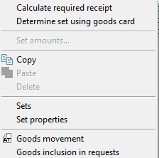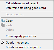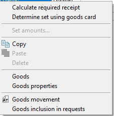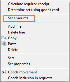 For Requests, the determination of amounts and tax rates occurs either manually or from the product cards. In addition to the aforementioned methods for setting amounts and tax rates, there is a group function available for the goods in an open request called "Set Amounts...". This function can be invoked through the context menu.