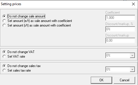 To change amounts in the request in the "Set Amounts..." window, select which amount needs to be changed (Sum e/t or Sum i/t) and choose the method of modification: