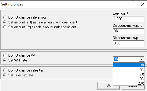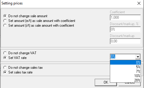 Additionally, through the "Set Amounts..." function, tax rates for selected goods in the request can also be changed. To do this: