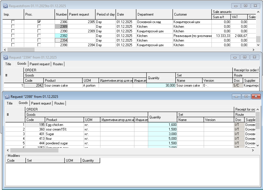 If there are no specified routes in the goods card associated with the set, the Department and Customer fields of the child request will be populated with the department selected in the Department field of the "parent request". Thus, the child request essentially becomes an "order" for the ingredients of the goods from the parent request to the customer department.
