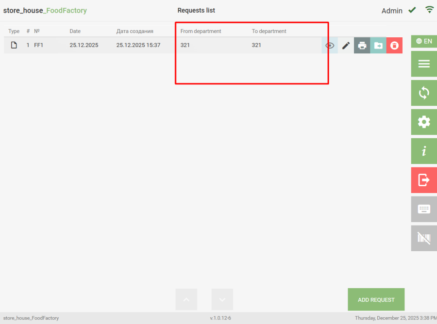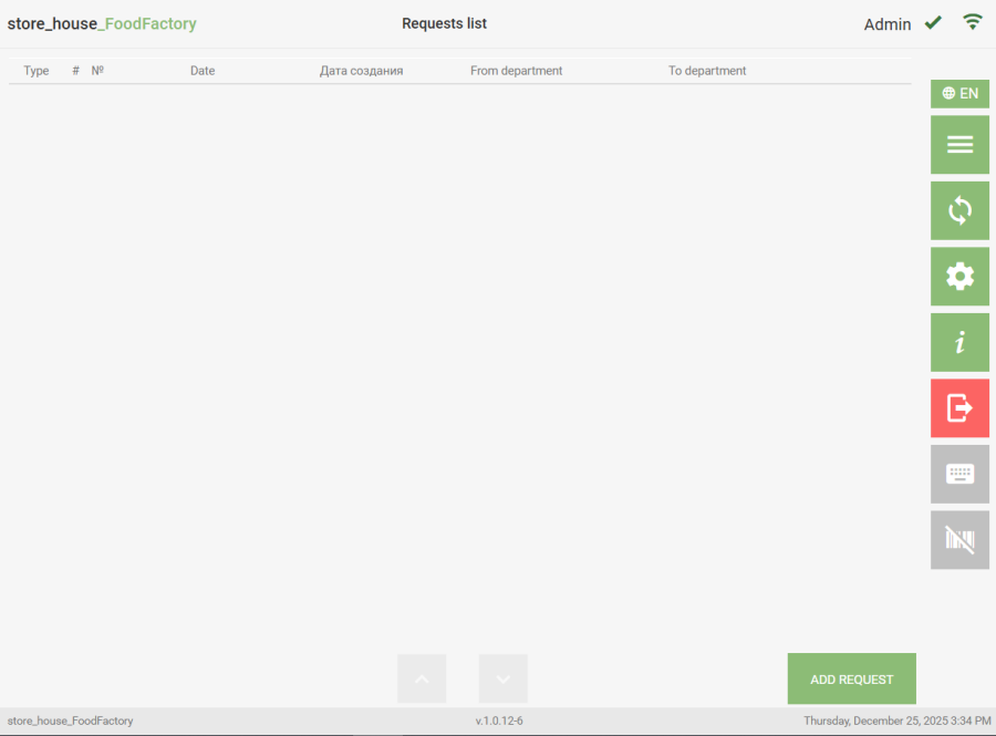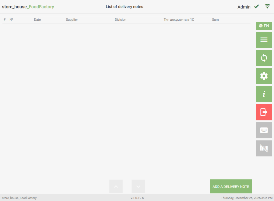 To navigate to the list of documents of a specific type, select the required operation from the Operations list in the Main Menu. The system will then switch to the Document List mode of the selected type. An empty list looks like this: To create a new document, click the "Add a Delivery Note" or "Add Request" button (Receipt note, Expenditure Delivery Note, Internal Transfer, Collation Statement, Set Creation, Processing note). All saved documents of the selected type that have not been uploaded to r_k StoreHouse Pro will be displayed in this list. Example of an expenditure delivery notes list: If document settings have selected attributes for lists, columns for these attributes will be displayed in the document list regardless of whether these fields are filled in the delivery note or request. - draft of a new delivery note or request. - draft of a created delivery note or request. Working with drafts is described in the section "Working with Drafts".