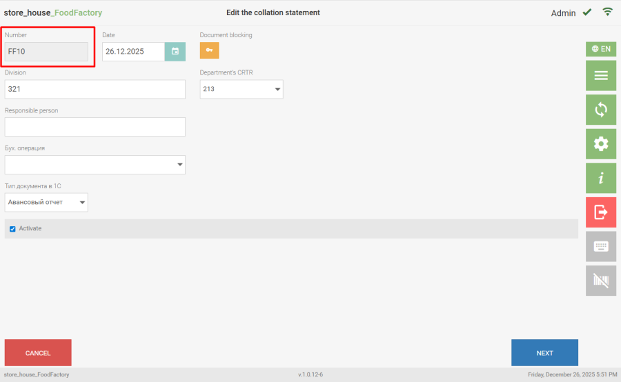 The "Number" field is unavailable for editing because the number is assigned automatically when saving the document, and the prefix for document numbering, if necessary, is entered in the document settings. Starting from FoodFactory version 1.0.11-15, ONLY for receipt notes, editing the "Number" field is available. |