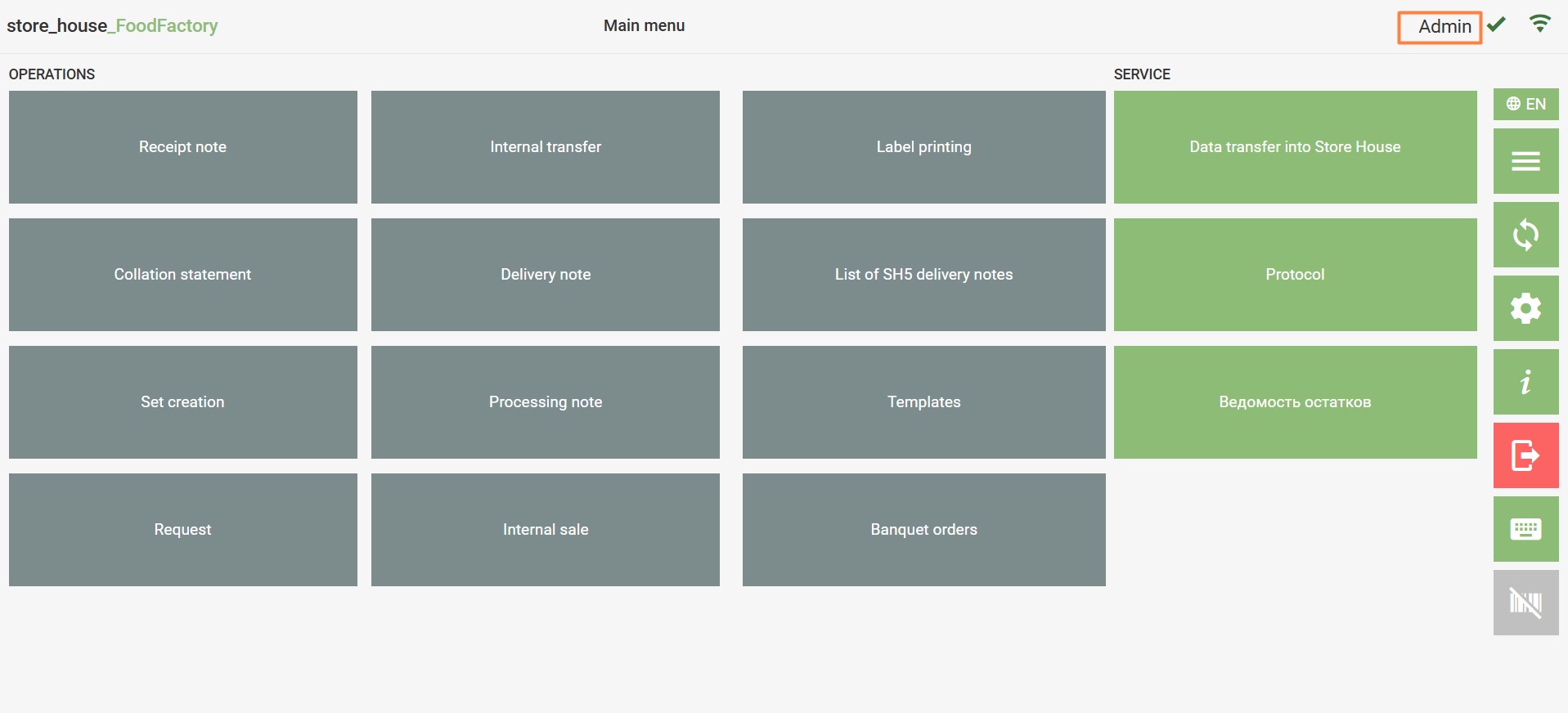 If the connection to the StoreHouse5 server is established, a green wireless icon will be displayed in the upper right corner. If the connection to the StoreHouse5 server is not established, a red wireless icon and the message "Store House 5 Server is unavailable" will be displayed in the upper right corner. In this case, automatic synchronization and data transfer from FoodFactory to StoreHouse5 will be unavailable.