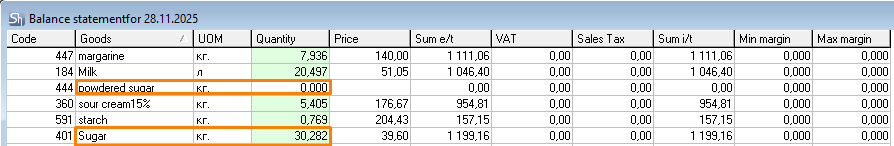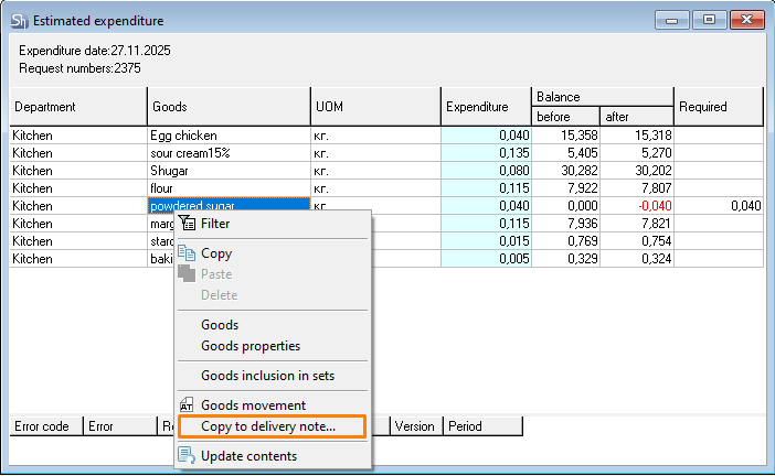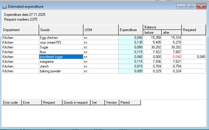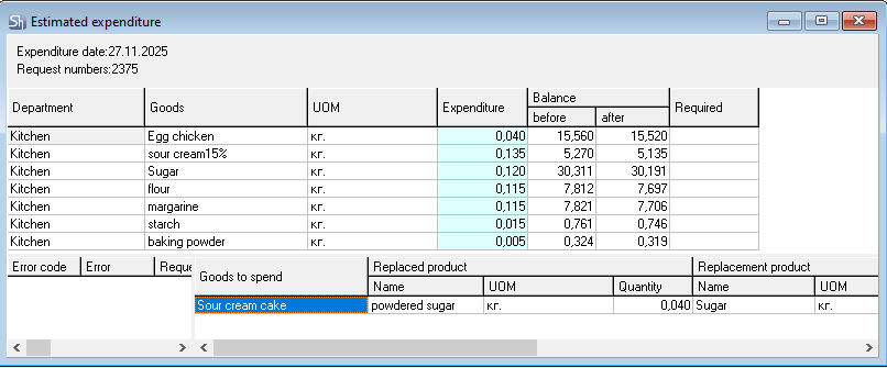 The Estimated expenditure shows that 40 grams of "powdered sugar" are needed for correct write-off. The department's balance has 0 grams. But the balance has goods that can be used for replacement.