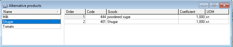 When setting the "use interchangeable substitutions" flag, the system automatically starts using the specified interchange rules. Since the goods "powdered sugar" are insufficient for a complete replacement of the main ingredient, after the complete write-off of the goods "powdered sugar", the system moves to the balances of the next goods from the interchangeable substitutions group, "Sugar".