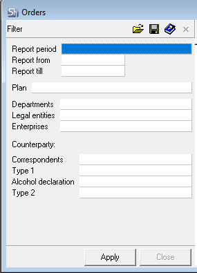 Correspondent– in this group of fields, you can define the list of correspondents for whom orders have been formed. Selection of correspondents can be done by additional fields "Type 1", "Alc. Declaration", "Type 2".