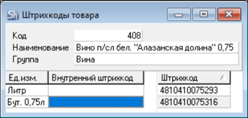 Select the UOM for which you need to print the external barcode from the r_k StoreHouse Pro product card. If there are multiple external barcodes for one UOM, a selection will be offered. If the barcode is unique for the selected UOM, the barcode selection window will be skipped.
