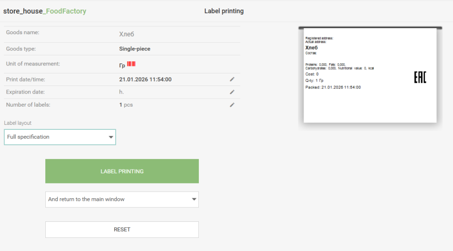 To determine which window opens after printing the single-piece label, select the next action in the field below the "Print Labels" button, similar to selecting the action after printing a weighted label. To close the label layout preview window and go to the window for selecting the type of goods item for label printing, click the "Reset" button.