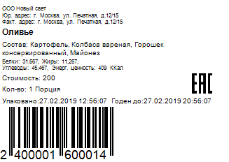 Information about the goods item's energy value and its cost is taken for printing from the product card in r_k StoreHouse Pro. |