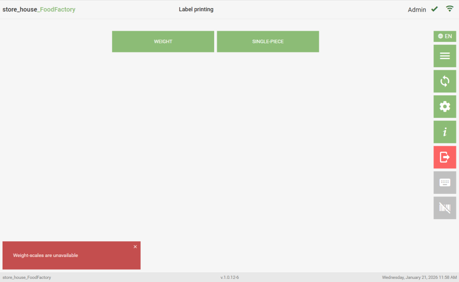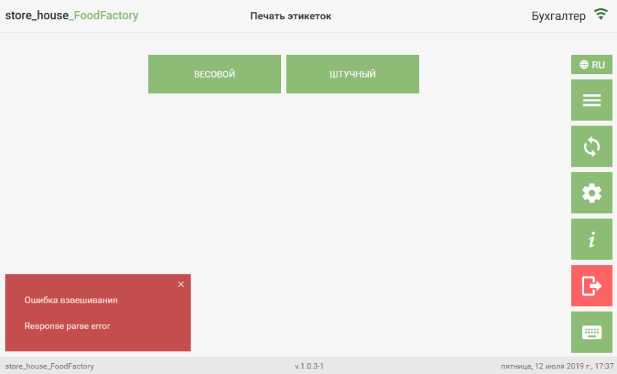 If the scale server is running but the scales are turned off, an error message about weighing failure will appear after selecting the goods item.