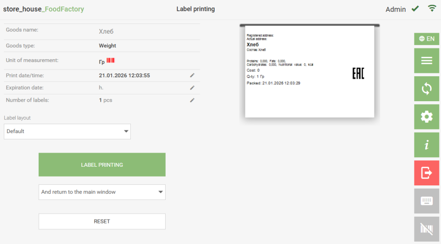 . If the shelf life is specified on the selected goods item's card in StoreHouse5, the shelf life entry window will not open, and regardless of the "Set Expiration Date Before Printing" setting, the shelf life from the product card will be used for printing the label. The shelf life is calculated as: "Packed" - the physical time of label printing "Expiry Date" - physical time of printing + number of hours of shelf life (either from the product card or entered manually). Next, the window for entering the number of labels for printing will open.