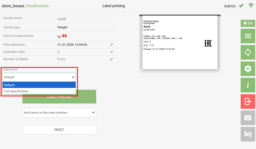 By default, the label layout selected in the print settings is set. If a layout different from the default one is selected for printing labels, it will be used until the end of the label printing session, i.e., until you return to the main menu or exit the program. The label layout contains information.