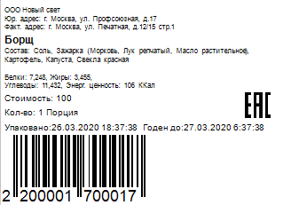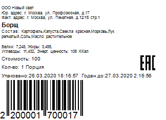 Information about the goods item's energy value and its price is taken for printing from the product card in r_k StoreHouse Pro. |