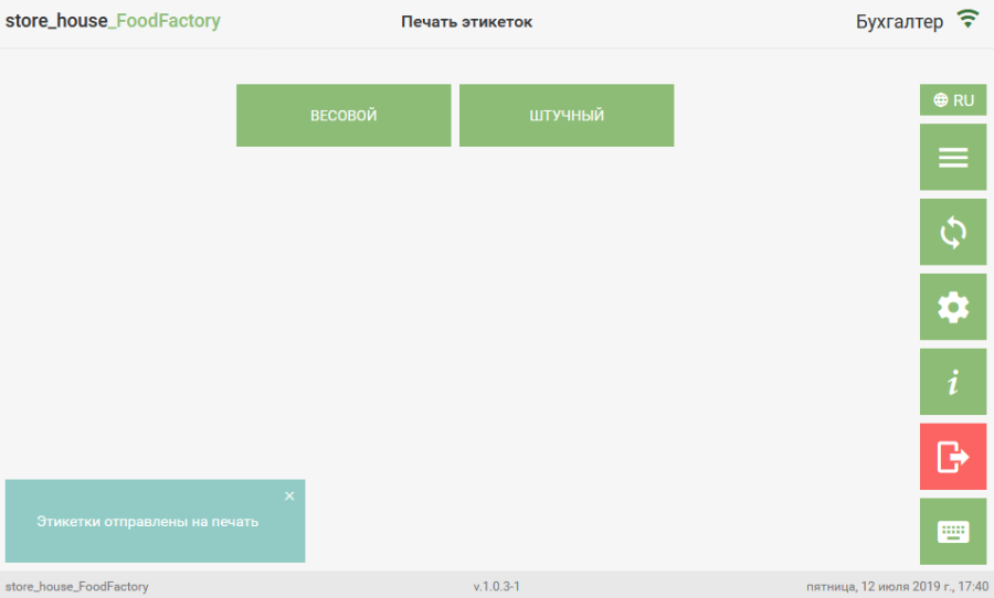 Price – the value is taken from the r_k StoreHouse Pro product card as the "sale amount" per base UOM. When determining the price, "exceptions by enterprises" are considered according to the department set for label printing. These settings also determine which value to use for printing: "Including taxes" or "Excluding taxes". Cost – the calculated cost for the weighted quantity of the goods item. If the base UOM of the goods item is not the "default weighted UOM for printing", the cost will be recalculated using the UOM conversion ratios from the r_k StoreHouse Pro product card. To print the label, click the "Print Labels" button. The labels will then be sent to the printer, and a message will appear on the screen.