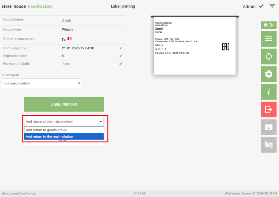 When selecting the option "And return to the goods group", after printing the label, the goods group from which the previous goods item was selected for label printing will open. When selecting the option "And return to the main window", the window for selecting the type of goods item for label printing will open.