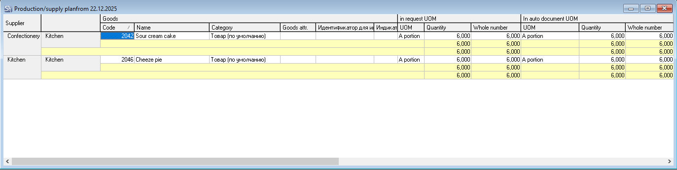 Different units of measurement can be defined on the goods card. And the order unit of measurement may differ from the supply unit of measurement. Information for both units of measurement is displayed in the report (see Classic Cheesecake).