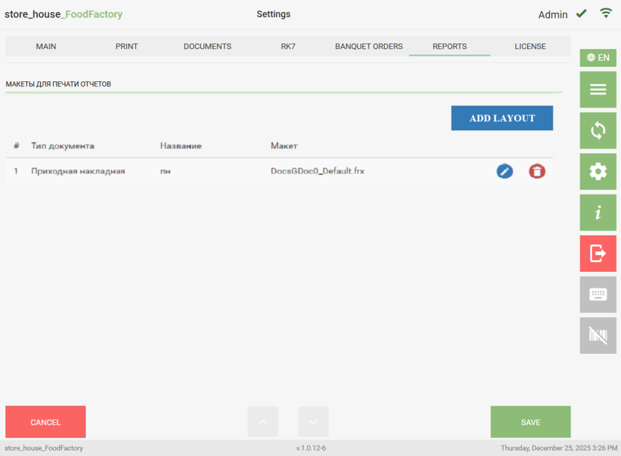 Documents in FoodFactory have a number of predefined layouts for printing. There is also the ability to create custom layouts using ReportDesigner.exe. To connect custom layouts in FoodFactory, on the "Reports" tab, define the use of layouts. To do this, click the "ADD LAYOUT" button.