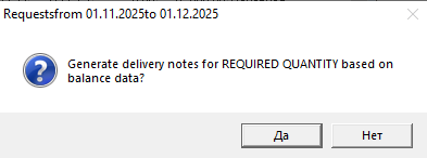The system will prompt you to choose for which quantity of the request (the quantity of the request itself or the required receipt) to create delivery notes for receipt. Click [Yes] to create delivery notes for the quantity according to the required receipt. Click [No] to create delivery notes for receipt for the quantity from the request.