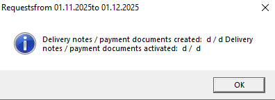 In cases where delivery notes cannot be created, a message appears: "Delivery notes/payment documents created: 0/0. Delivery notes/payment documents activated: 0/0"