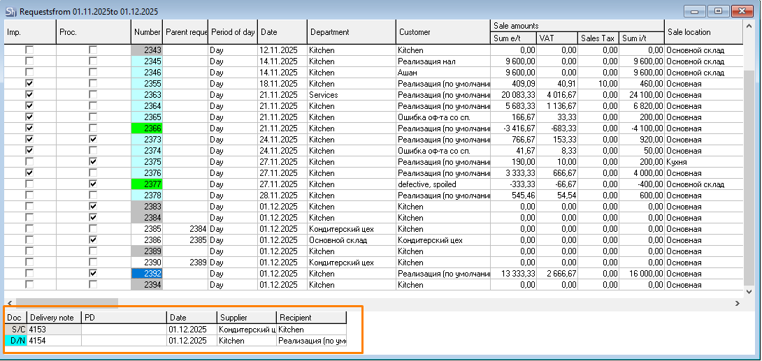 Delivery notes created as a result of the "Create Delivery Notes for Request" operation are displayed in the lower part of the Request window. Delivery notes created for request number 1484 are highlighted in red.