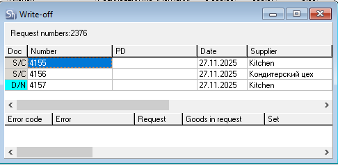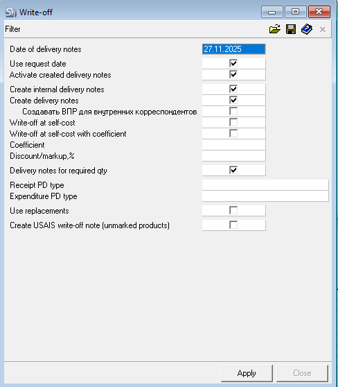 To create delivery notes based on external requests, select the necessary requests in the list, call the context menu and select the item "Write-off". A filter for generating delivery notes for the selected external requests will open.