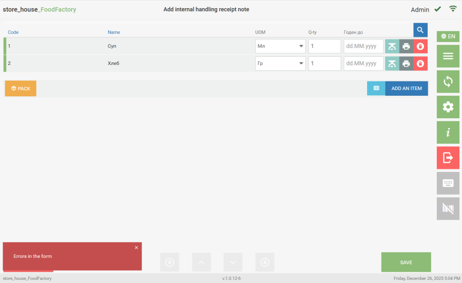 Mandatory fields are highlighted with a red frame. After filling them in, the document can be saved. During document saving, a number will be assigned to it: delivery notes and requests are numbered separately. If a prefix was entered in the "Document Numbering Prefix" field in the document settings, it will be indicated before the document number.